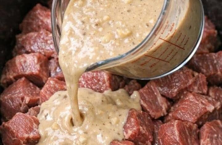 Combine: Pour the mixture over the beef cubes and stir slightly to ensure all meat is coated.