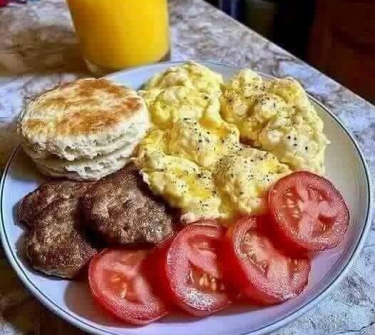1. Breakfast Feast with Scrambled Eggs, Sausage Patties, Biscuits, and Tomatoes!
