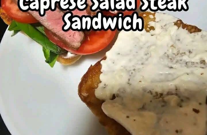 Layer sliced steak, fresh mozzarella, tomato slices, and basil leaves.