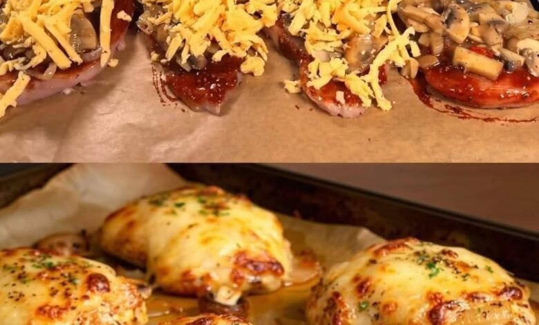 This dish is a crowd-pleaser—tender chicken breasts topped with savory sautéed mushrooms and a golden, bubbly layer of cheese.
