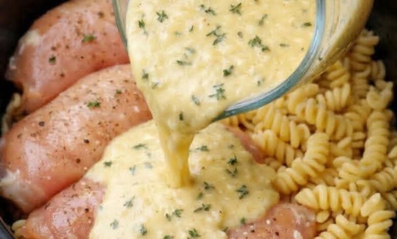 – Place the dry pasta in the bottom of the slow cooker and spread evenly. Arrange the seasoned chicken breasts on top. Pour the chicken broth and cream over the pasta and chicken so the pasta is partially covered. Add the sautéed onion/garlic mixture, cream cheese (if using), and half of the shredded cheese (reserve the rest for finishing). Add lemon juice and the remaining seasonings.