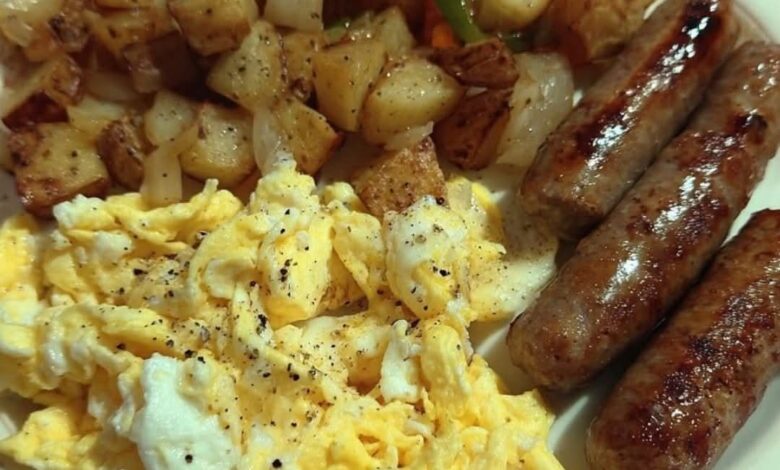 Toast the bread and butter it if you’re feeling extra. Plate up the eggs, home fries, and sausage—this is a diner-style breakfast, simple comfort meal, family favorite vibe all the way.