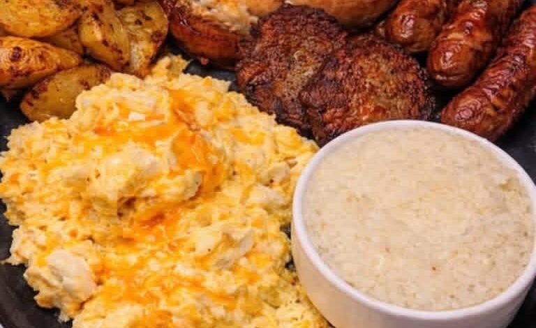 A comforting, full-flavored breakfast loaded with juicy meats, crispy potatoes, fluffy cheesy eggs, and smooth buttery grits π€€β¨