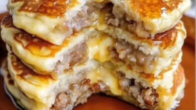 Sausage Dipped Pancakes Ingredients: 1 lb ground breakfast sausage 1 cup shredded cheddar or mozzarella cheese 2 cups pancake mix…