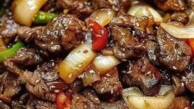 Beef Stir-Fry # Ingredients: 1. **Beef** (sliced thin) 2. **Onion** (sliced) 3. **Bell Peppers** (red and green, sliced)…