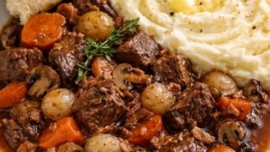 Beef Bourguignon Meat and sauce: – 1.2–1.5 kg (about 2.6–3.3 lb) beef, cut into large cubes (chuck, shoulder, or…