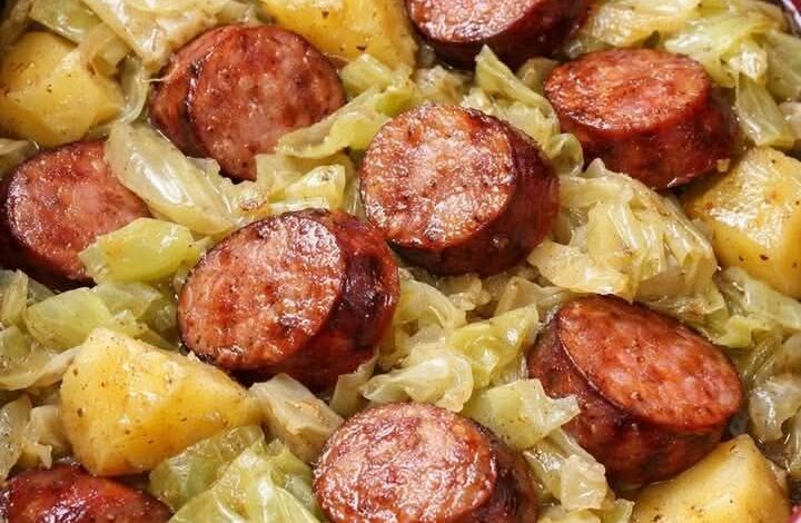 Layering: Place the cabbage at the bottom of the slow cooker (or pot), add the potatoes on top, and finally layer the sausage slices over the vegetables.