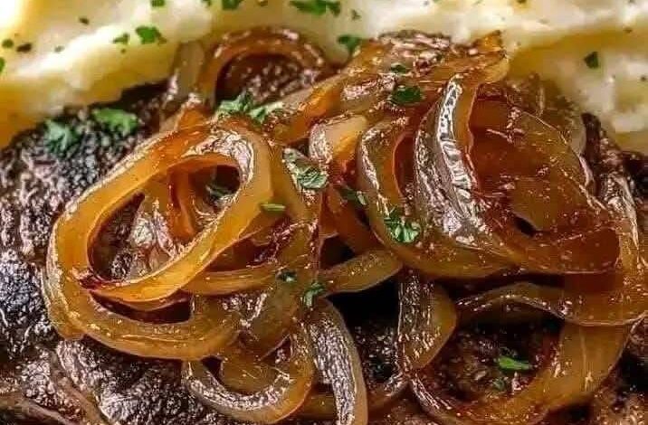 This dish is the epitome of comfort food—a tender Salisbury steak patty sitting atop creamy mashed potatoes, smothered in a rich mushroom and onion gravy.