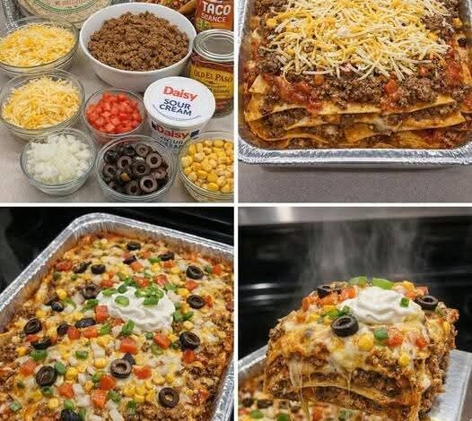 – Repeat the layers (noodles, meat, sour cream, cheese).